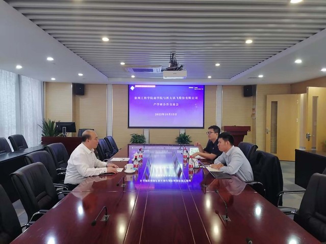 之后双方进行了座谈交流。王明松等介绍了科大讯飞在智慧教育、产品研发及目前共建实验室、专项实验室等方面的建设情况。王凤羽经理从产教融合、科学研究、项目申报、人才培养、团队队伍建设、员工就业等方面介绍了公司基本情况,目前与企业、政府的合作模式以及与科大讯飞前期合作的基础。双方一致认为科大讯飞有着强大的科技实力,能够为人工智能+教育产业建设作出更大的赋能,并阐述了共建思路,希望双方能在课程资源开发、团队队伍建设、科研项目申报、智慧实训室创新等方面进行更为深入的合作。