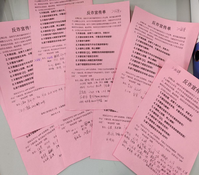 第二个环节,各班签署防诈承诺书。将预防金融电信诈骗宣传单发放到每间宿舍和教室统一由班委宣读防诈骗知识,宿舍成员和班级成员做出承诺并在宣传单上签下自己的名字,积极营出预防金融电信诈骗的良好宣传氛围。