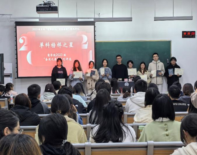 本次活动分为两个部分,首先,2023级辅导员季慷老师对获奖同学进行颁奖,其中涵盖,进步励志之星13人,单科榜样第一18人,班级榜样之星27人,专业榜样之星10人以及少数民族自强标兵2人。这些同学在学习态度和学业表现方面均很突出,在班内和年级内起到了良好的表率作用。本次线下集中公开表彰既是对他们一年以来勤奋学习的鼓励,为未来的学习提供动力与信心,也为其他同学提供了学习榜样。