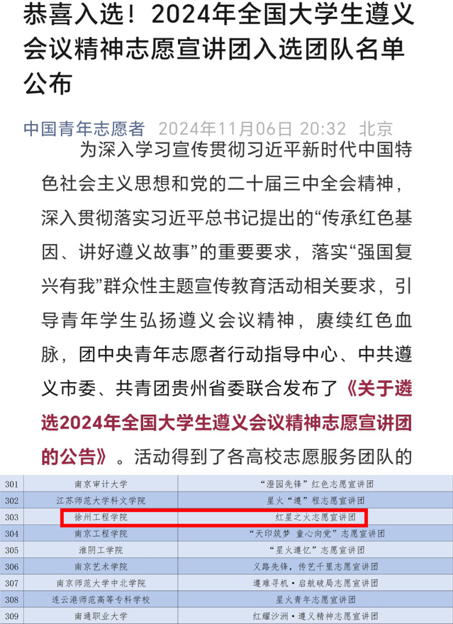 为深入学习宣传贯彻习近平新时代中国特色社会主义思想和党的二十届三中全会精神,引导动员青年员工大力弘扬革命精神,近日,团中央青年志愿者行动指导中心等单位联合发布了《关于遴选2024年全国老员工遵义会议精神志愿宣讲团的公告》,公司“红星之火志愿宣讲团”最终入选全国1000支老员工志愿服务团队。